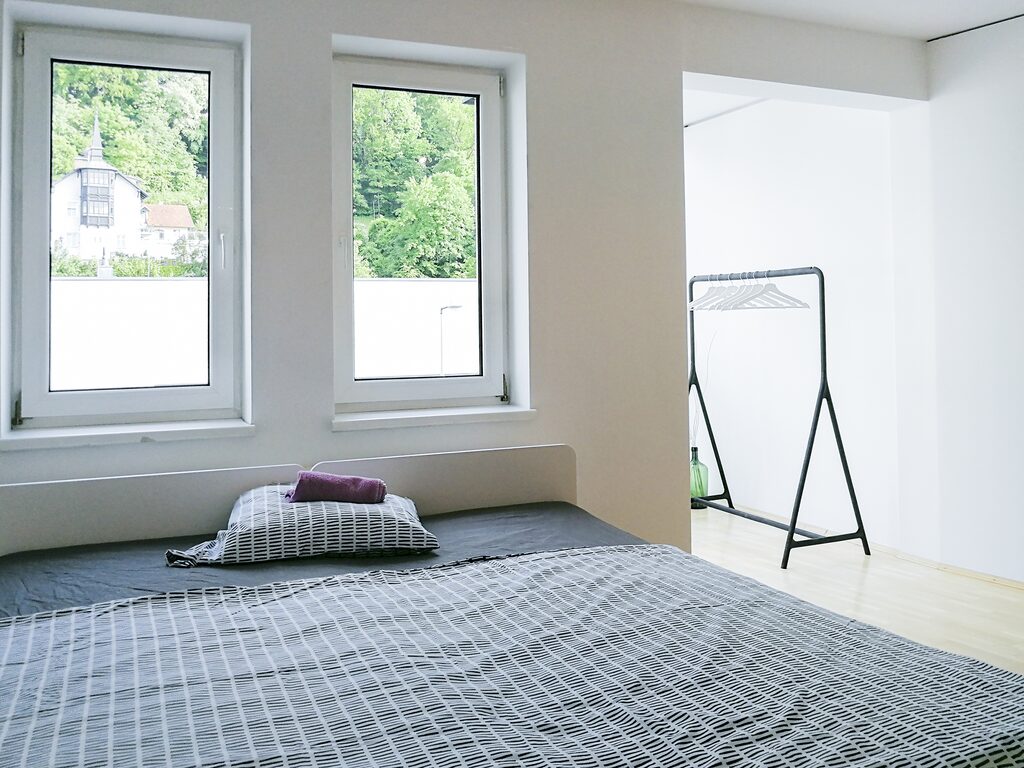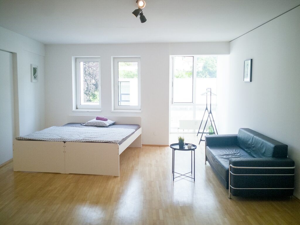 Die 48 m² große Wohnung befindet sich im 2. Liftstockwerk eines Mehrparteienhauses. Im Wohnraum befindet sich ein Doppelbett,