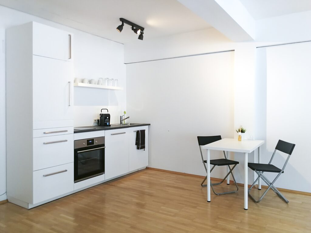 eine Schlafcouch für zwei Personen und einer kleinen, aber feinen Küchennische. Bis zu vier Personen können das Apartment nutzen.